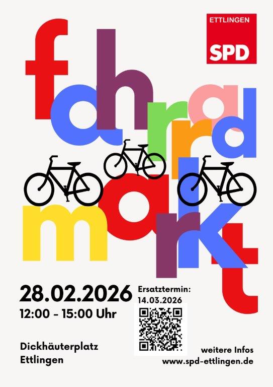 Unser Fahrradmarkt findet am Samstag, den 28. Februar 2026 von 12 Uhr bis 15 Uhr auf dem Dickhäuterplatz in Ettlingen statt. (Bei schlechtem Wetter - Regen, Schnee, Wind - verlegen wir den Termin auf den 14. März 2026 und teilen dies auf unseren Social-Media-Kanälen mit.)