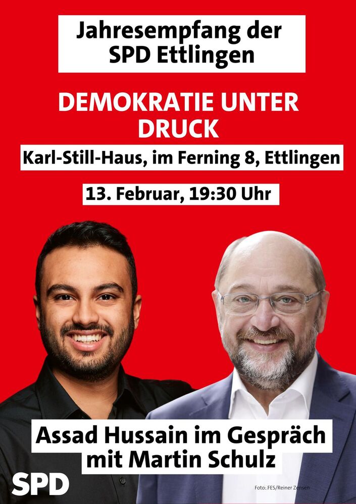 Wir freuen uns über den Besuch von Martin Schulz, Vorsitzender der Friedrich-Ebert-Stiftung, EU-Parlamentspräsident 2012 - 2017, Träger des Karlspreises für seine bedeutenden Verdienste um die Stärkung des Parlaments und der demokratischen Legitimation in der EU und unseres Bundestagskandidaten Assad Hussain zum Thema "Demokratie unter Druck".